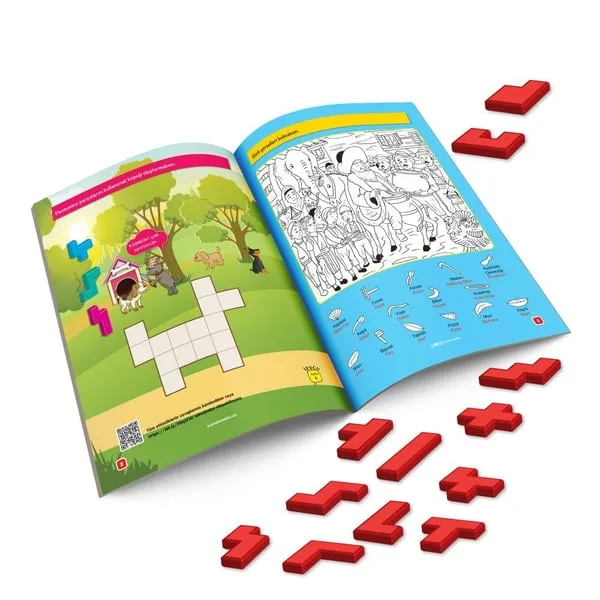 Pentomino Zeka Soruları(12 parçadan oluşan bu sorular kolaydan zora ilerlemektedir. Bu sayede çocuklarda uzun süreli dikkatin geliştirilmesine destek sunmaktadır.