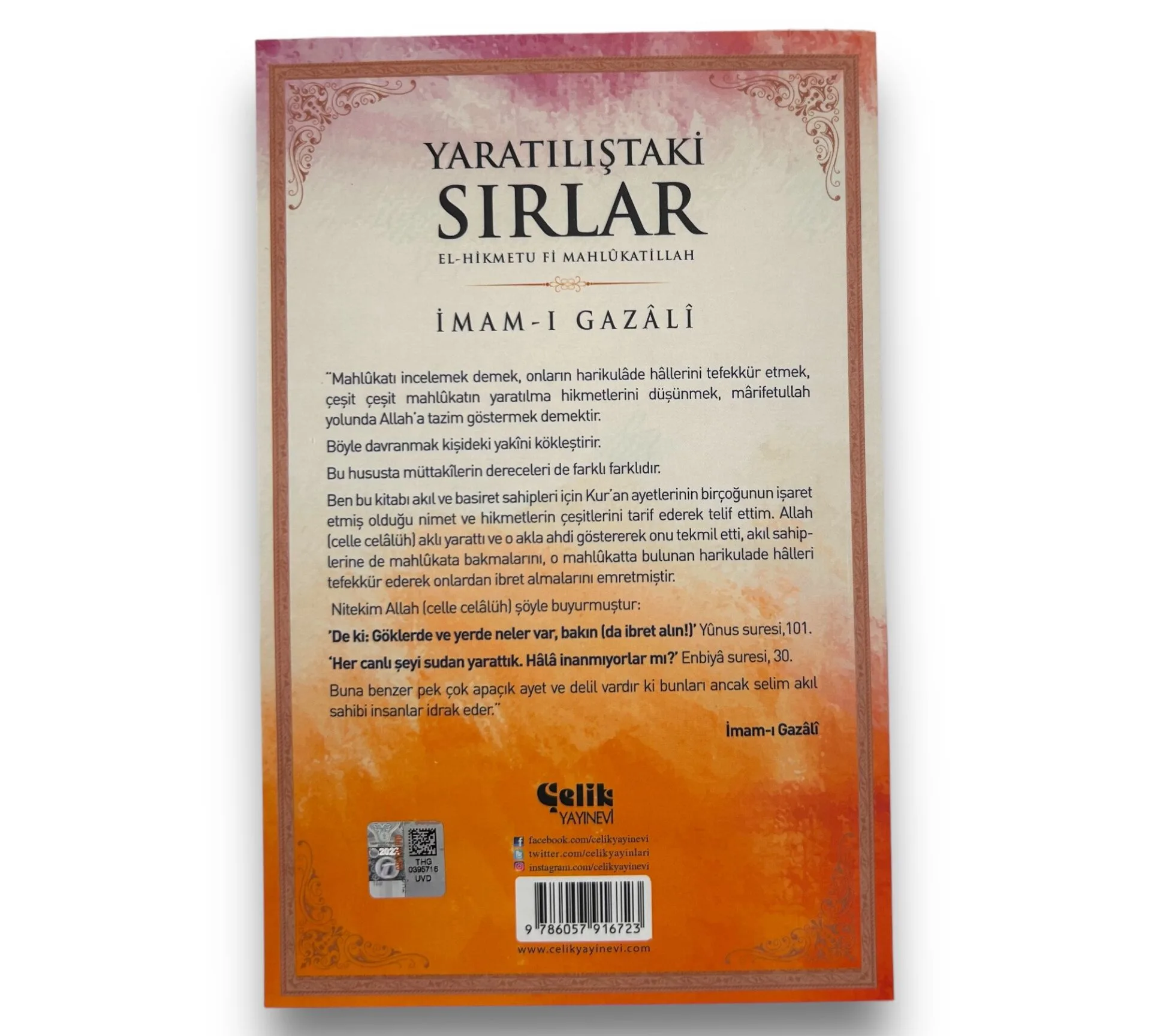 Mahlûkatı incelemek, onların harikulâde hâllerini tefekkür etmek, çeşit çeşit mahlûkatın yaratılma hikmetlerini düşünmek, mârifetullah yolunda Allah’a tazim göstermek demektir. Böyle davranmak kişideki yakini kökleştirir. Bu hususta müttakilerin dereceleri de farklı farklıdır. Ben bu kitabı akıl ve basiret sâhipleri için Kuran âyetlerinin birçoğunun işaret etmiş olduğu nimet ve hikmetlerin çeşitlerini târif ederek telif ettim. (Allah celle celâlüh) aklı yarattı ve o akla ahdi göstererek onu tekmil etti, akıl sâhiplerine de mahlûkata bakmalarını, o mahlûkatta bulunan harikulâde hâlleri tefekkür ederek onlardan ibret almalarını emretmiştir. Nitekim Allah (celle celâlüh) şöyle buyurmuştur: “De ki: Göklerde ve yerde neler var, bakın da ibret alın!’